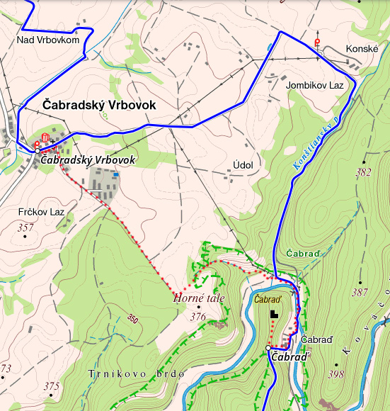 2) more demanding, but shorter route: (red dotted route on our map) Below the church, turn right towards the cooperative. You need to pass by it and continue in that direction. There is a dirt road there – sometimes wet and overgrown. On the left you will have fields, on the right a forest. The road rises slightly until it reaches the top of the hill. There, from behind the field on the left, a forest approaches, to which a strip of grass leads. You can enter this forest along it. There are paths in the forest that converge into a gutter. You should always choose the one that leads the lowest. At the end of the gutter, the path branches, you need to go left. When you come to the cottage, go down through the meadow to the Litavica river. There is a path next to it. You should go against the current of the river, i.e. to the left. After a while, you will come to the road coming from Konské. This will lead you to the bridge over the river. From there, it is another 100 meters to the church. Next to it is a path to the castle. The length of this path is about 3-4 km. However, it is much more demanding in terms of orientation and fitness.